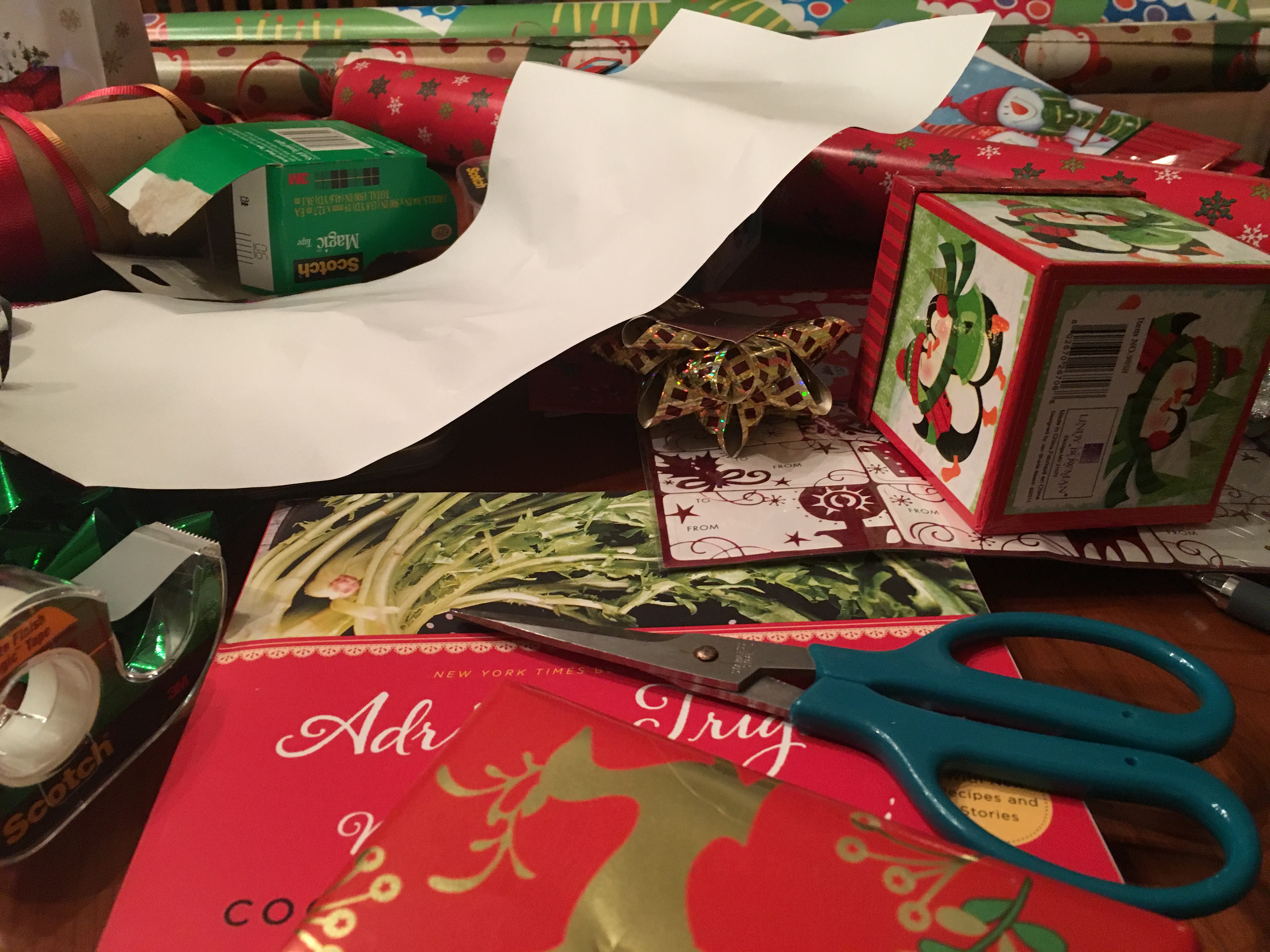 I like living on one floor. I really do. And I love my house. But do not expect to see kitchen counters cleared of clutter and punctuated with fascinating decorative items à la Joanna Gaines (of whom, incidentally, I’m a committed fan). That’s fine for people who don’t really cook in a big way. And since Christmas is an especially messy time of year, you will at any given time this week find, in our lovely little home, not only a floury mess in the kitchen, but also a tangle of gift wrapping in progress on the dining room table—wide open to all who cross the threshold. Some time between now and Christmas Eve, all will be put in order. But until then, let’s just say we have that “lived in” look, right out there in the open.