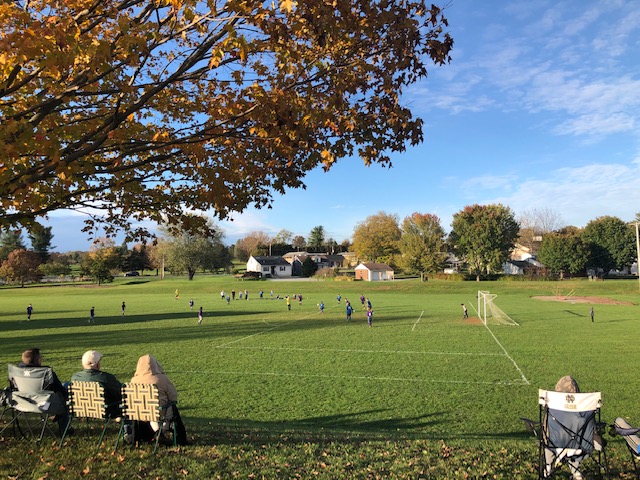 The good news is that I’m improving. A compression wrap has just about fixed the ankle and that stitch came out yesterday. I can walk Enzo as far as the mailbox almost without limping, though it will probably take another week tor two to get back to three good-sized walks a day. As for the arm—well, that’s a slower process. I’m trying red light therapy, thanks to my daughter, who had one shipped here yesterday. It can’t hurt. Fortunately, I was able to make it to one of our grandson’s last soccer games, which provided the vista in the featured photo.